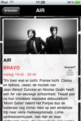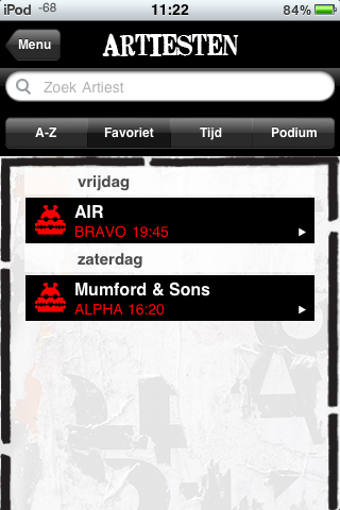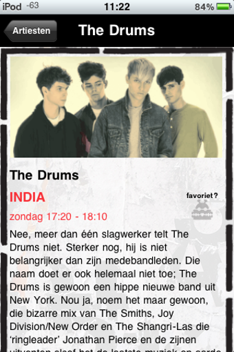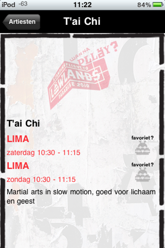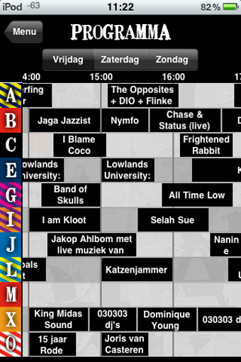 De applicatie start met een helder hoofdmenu, waarvandaan je het nieuws bekijkt (tweets van de organisatie), het programma doorneemt en op een kaart alle podia opzoekt. Ook check je vanuit Lowlands 2010 informatie over de artiesten, met de optie om hier je favorietenlijst samen te stellen. Favoriete bands staan daarna rood aangegeven op je programma, waardoor je gemakkelijker ziet waar je moet zijn tijdens het weekend.